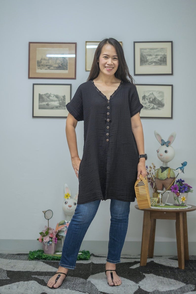 Short Sleeves V Neck tunic with coconut shell buttons